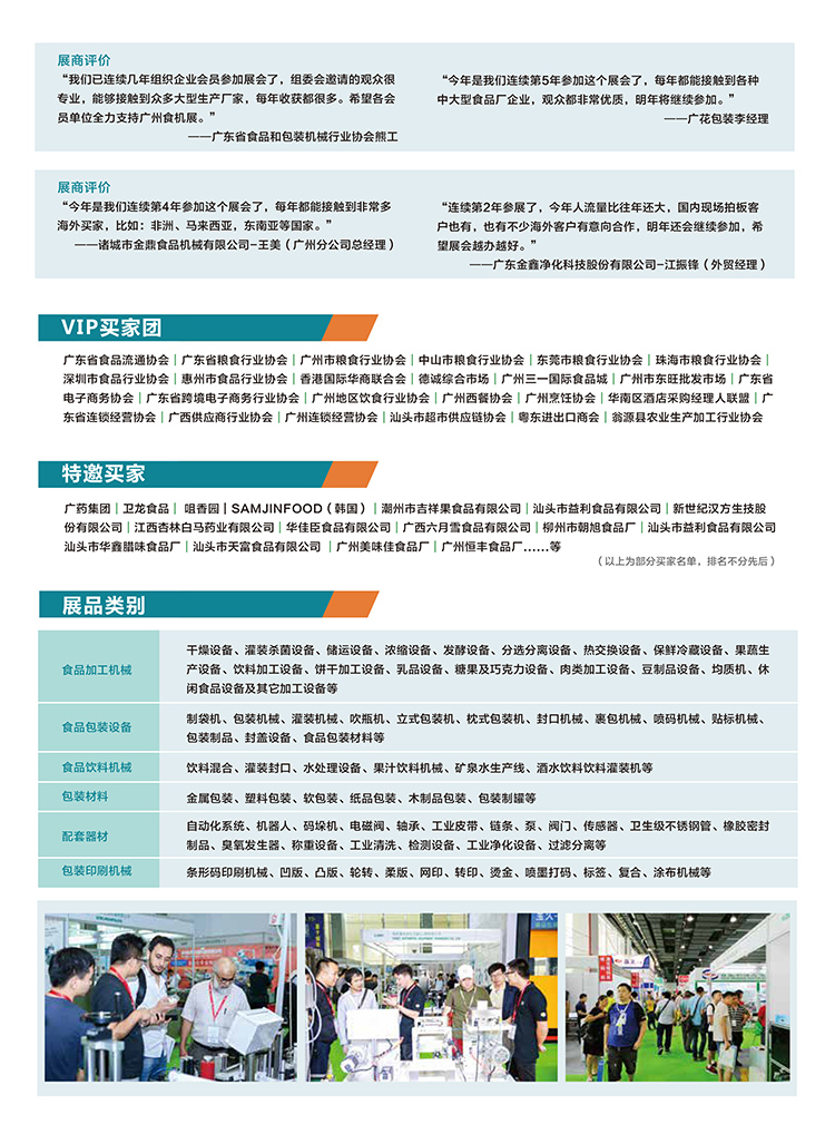 “我們已連續(xù)幾年組織企業(yè)會員參加展會了,組委會邀請的觀眾很專業(yè),能夠接觸到眾多大型生產(chǎn)廠家,每年收獲都很多。希望各會員單位全力支持廣州食機(jī)展?!?——廣東省食品和包裝機(jī)械行業(yè)協(xié)會熊工