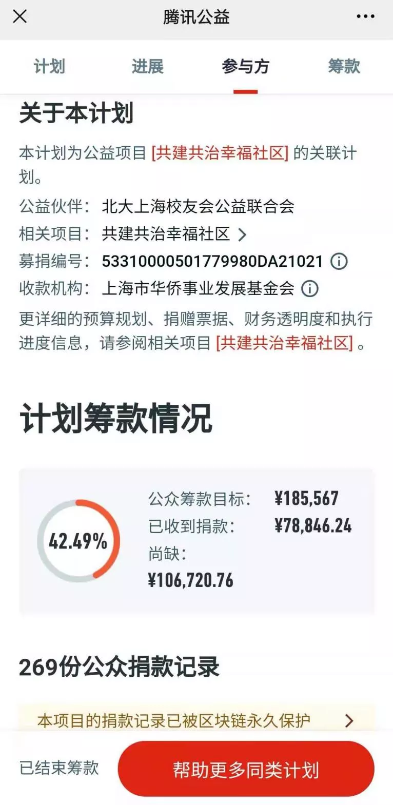 決算說明:本次籌款的發(fā)起方為北大上海校友會公益聯(lián)合會,執(zhí)行方上海浦東新區(qū)恩派公益基金會將其作為在騰訊公益平臺上發(fā)起的“共建共治幸福社區(qū)”的關(guān)聯(lián)項(xiàng)目進(jìn)行管理,資金管理方為上海市華僑事業(yè)發(fā)展基金會。北大上海校友會公益聯(lián)合會不收取管理費(fèi)用。