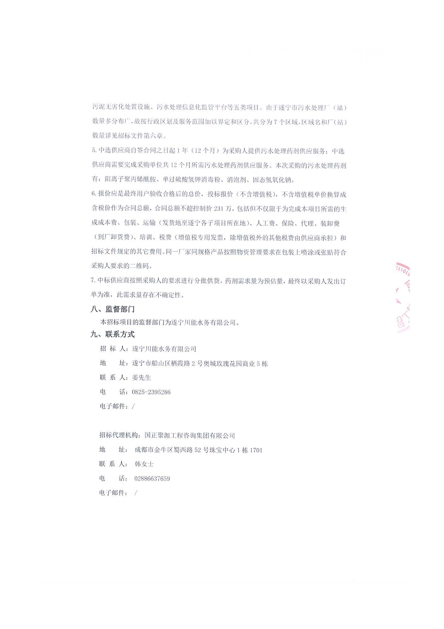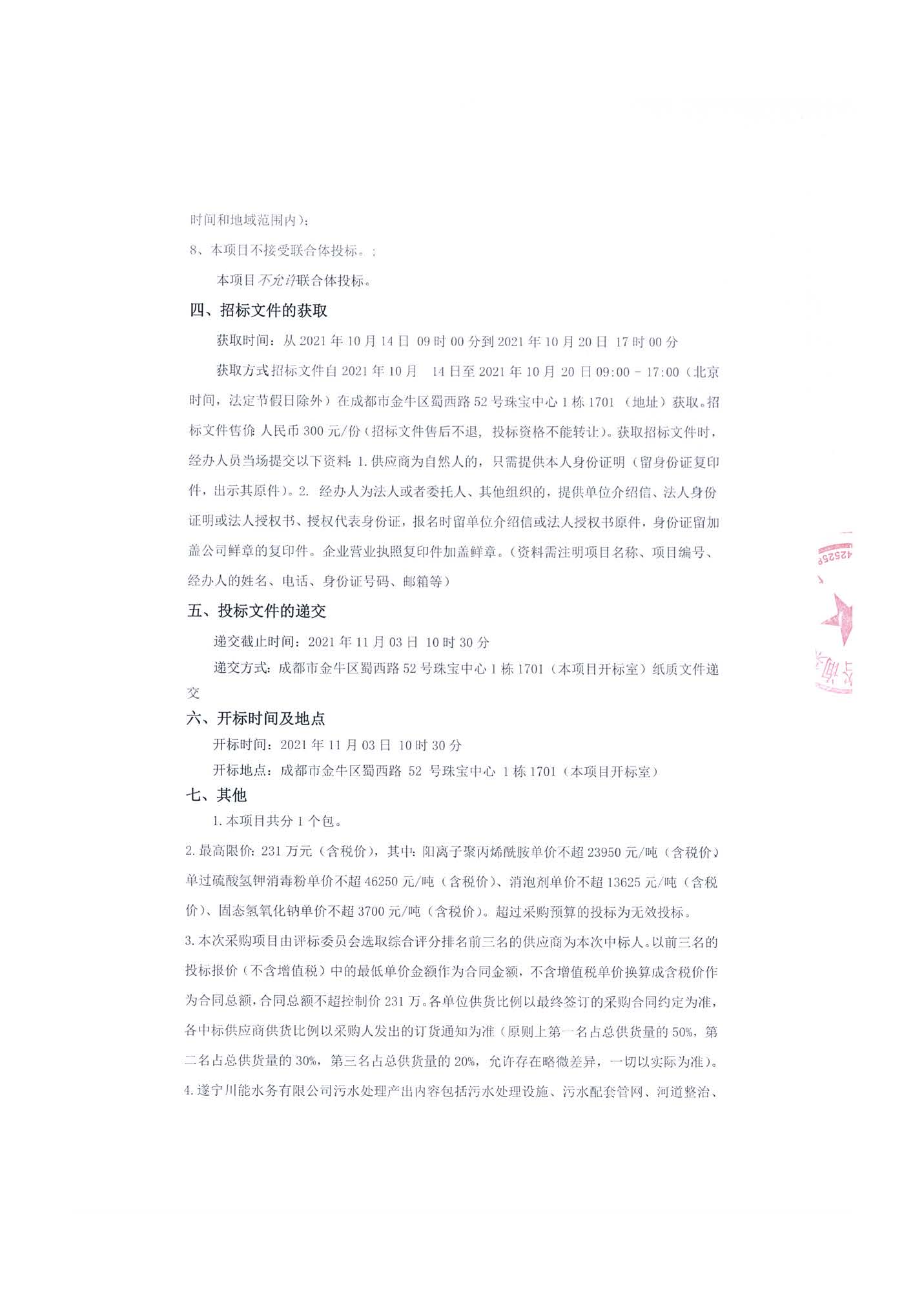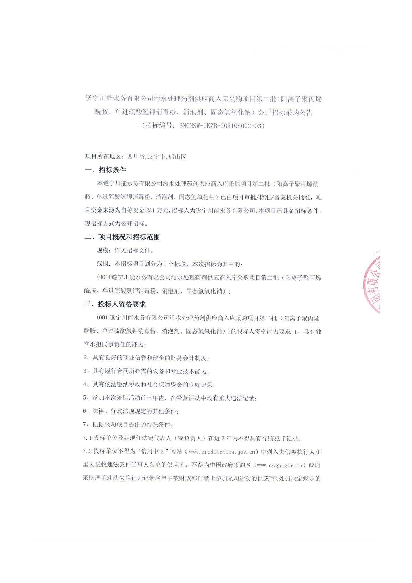 四川遂寧川能水務有限公司污水處理藥劑供應商入庫采購項目第二批(陽離子聚丙烯酰胺、單過硫酸氫鉀消毒粉、消泡劑、固態氫氧化鈉)公開招標采購公告