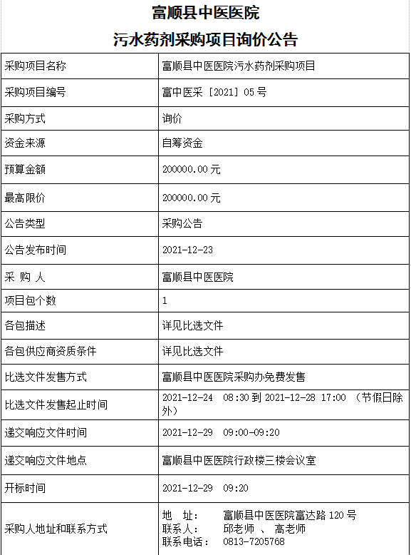 四川自貢富順縣中醫醫院污水藥劑采購項目詢價公告(二氧化氯)